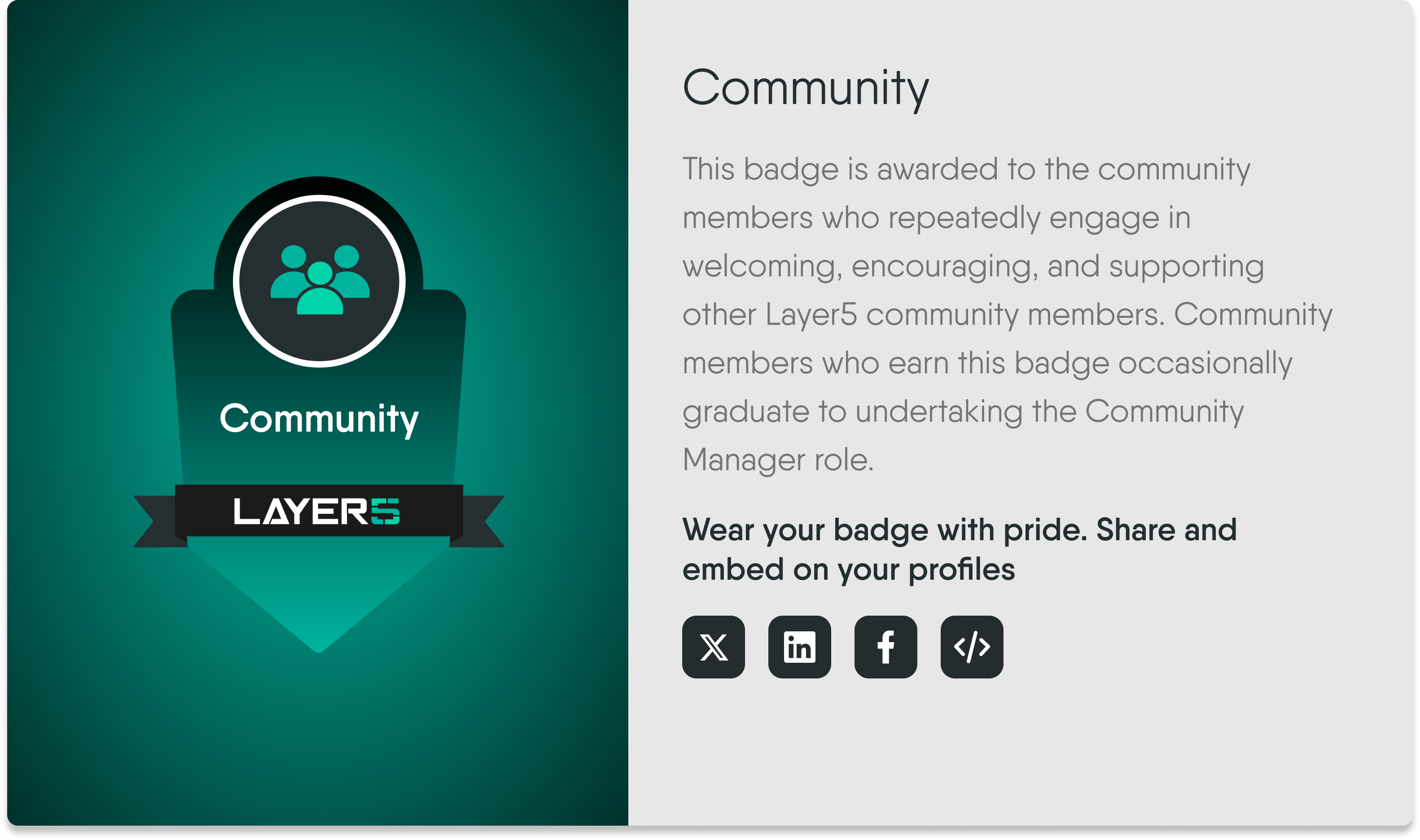 Community This badge is awarded to the community members who repeatedly engage in welcoming, encouraging, and supporting other Layer5 community members. Community members who earn this badge occasionally graduate to undertake the Community Manager role.
